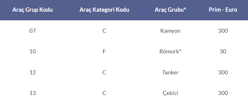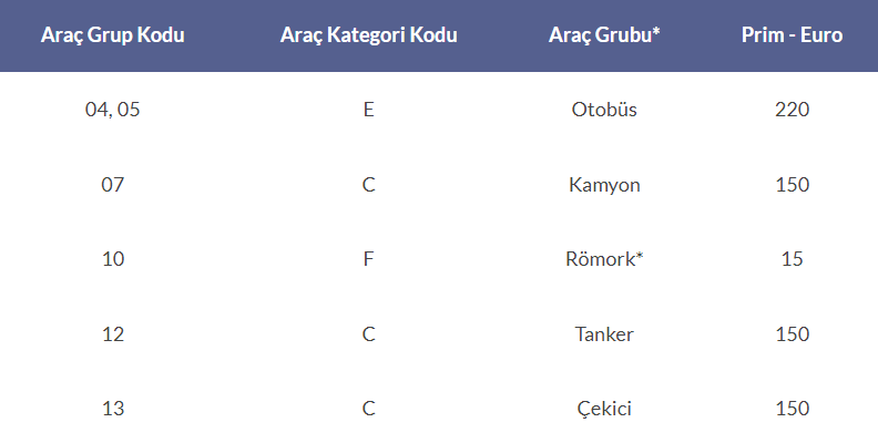 (*) Bu Tarife ve Talimatta belirtilen Römork araç grubu, insan taşımada kullanılmayan römorkları ifade etmektedir.